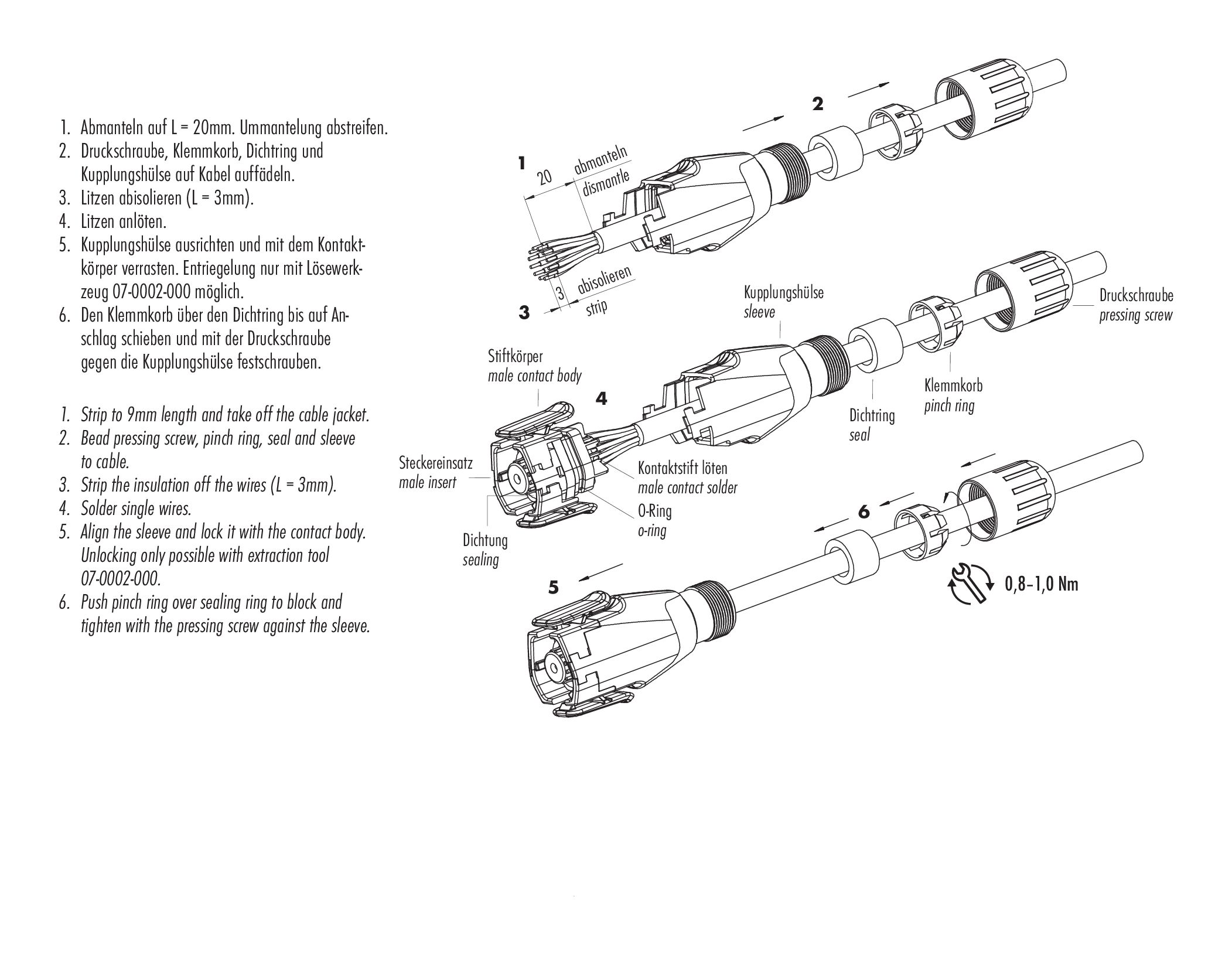 - Para proteger contra la apertura involuntaria del conector, la rosca entre la carcasa y la cabeza del conector debe asegurarse con un adhesivo de cianoacrilato adecuado cuando se use en circuitos con voltajes peligrosos al tacto. Esto no se aplica a los conectores utilizados en circuitos SELV y PELV según IEC 61140 (EN 61140, VDE 0140-1).