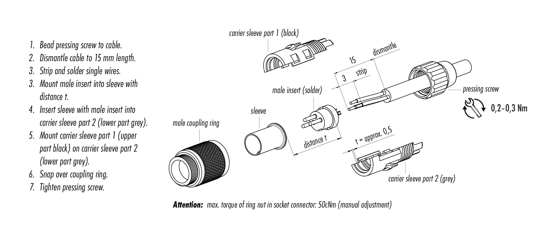- Para proteger contra la apertura involuntaria del conector, la rosca entre la carcasa y la cabeza del conector debe asegurarse con un adhesivo de cianoacrilato adecuado cuando se use en circuitos con voltajes peligrosos al tacto. Esto no se aplica a los conectores utilizados en circuitos SELV y PELV según IEC 61140 (EN 61140, VDE 0140-1).