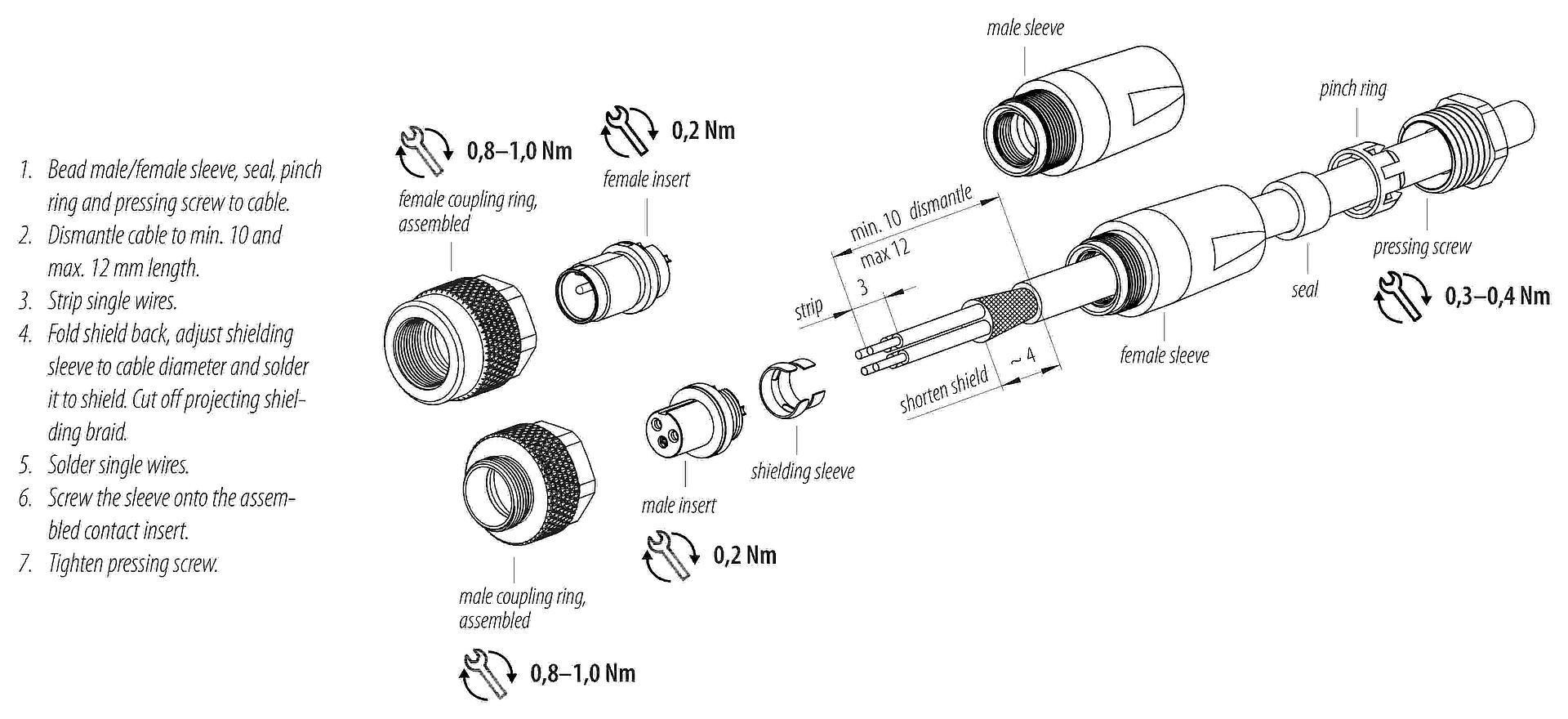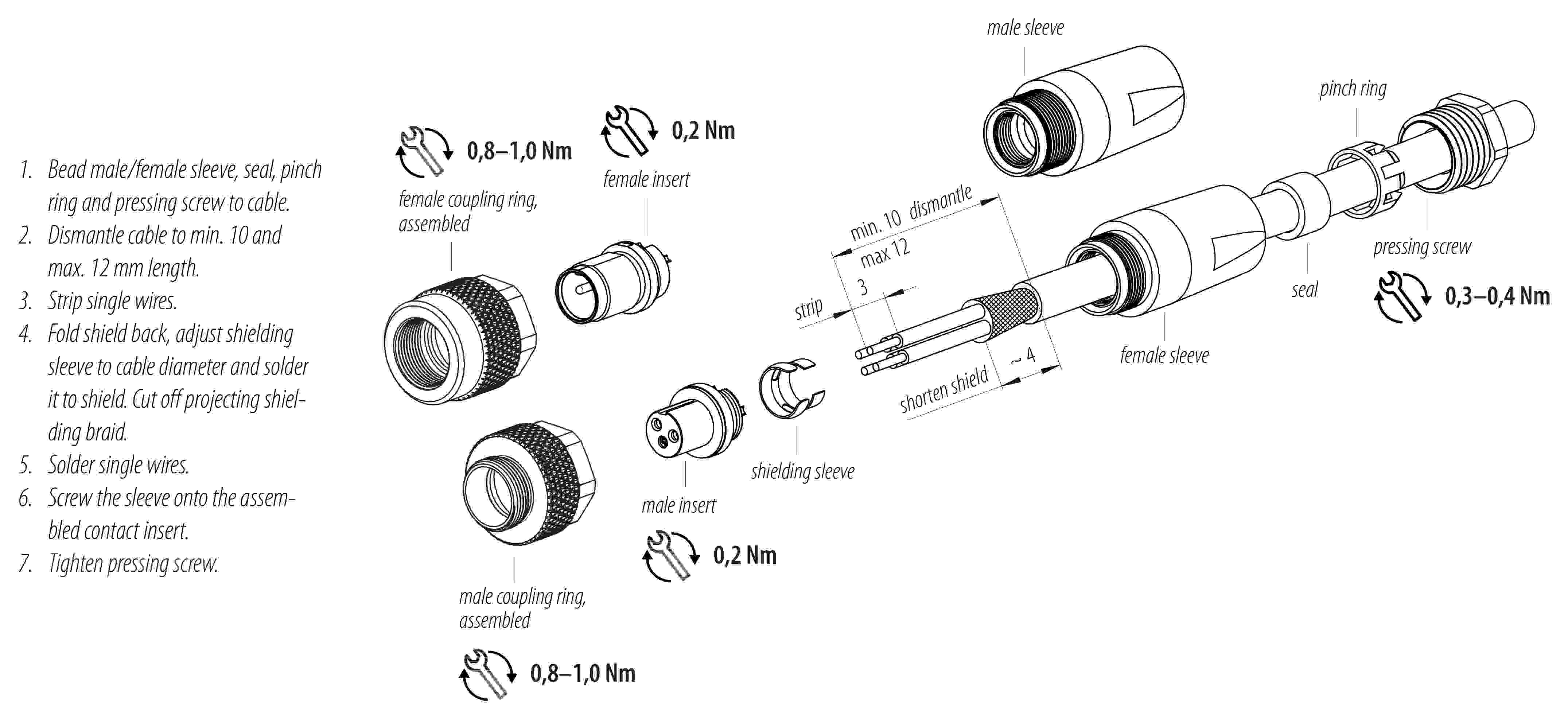 - Para proteger contra la apertura involuntaria del conector, la rosca entre la carcasa y la cabeza del conector debe asegurarse con un adhesivo de cianoacrilato adecuado cuando se use en circuitos con voltajes peligrosos al tacto. Esto no se aplica a los conectores utilizados en circuitos SELV y PELV según IEC 61140 (EN 61140, VDE 0140-1).