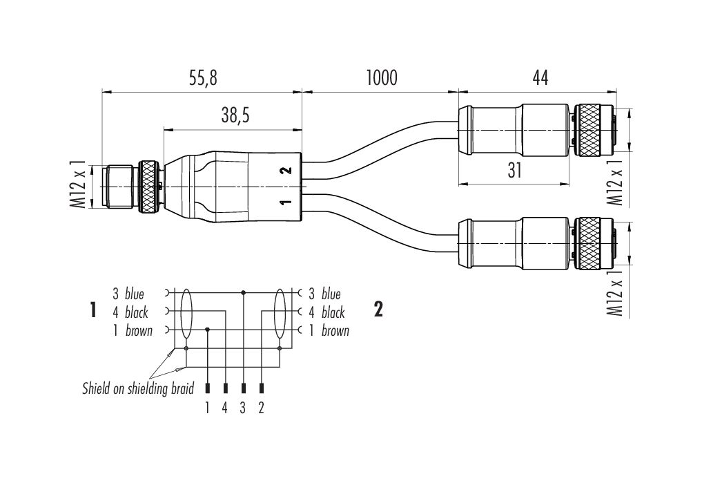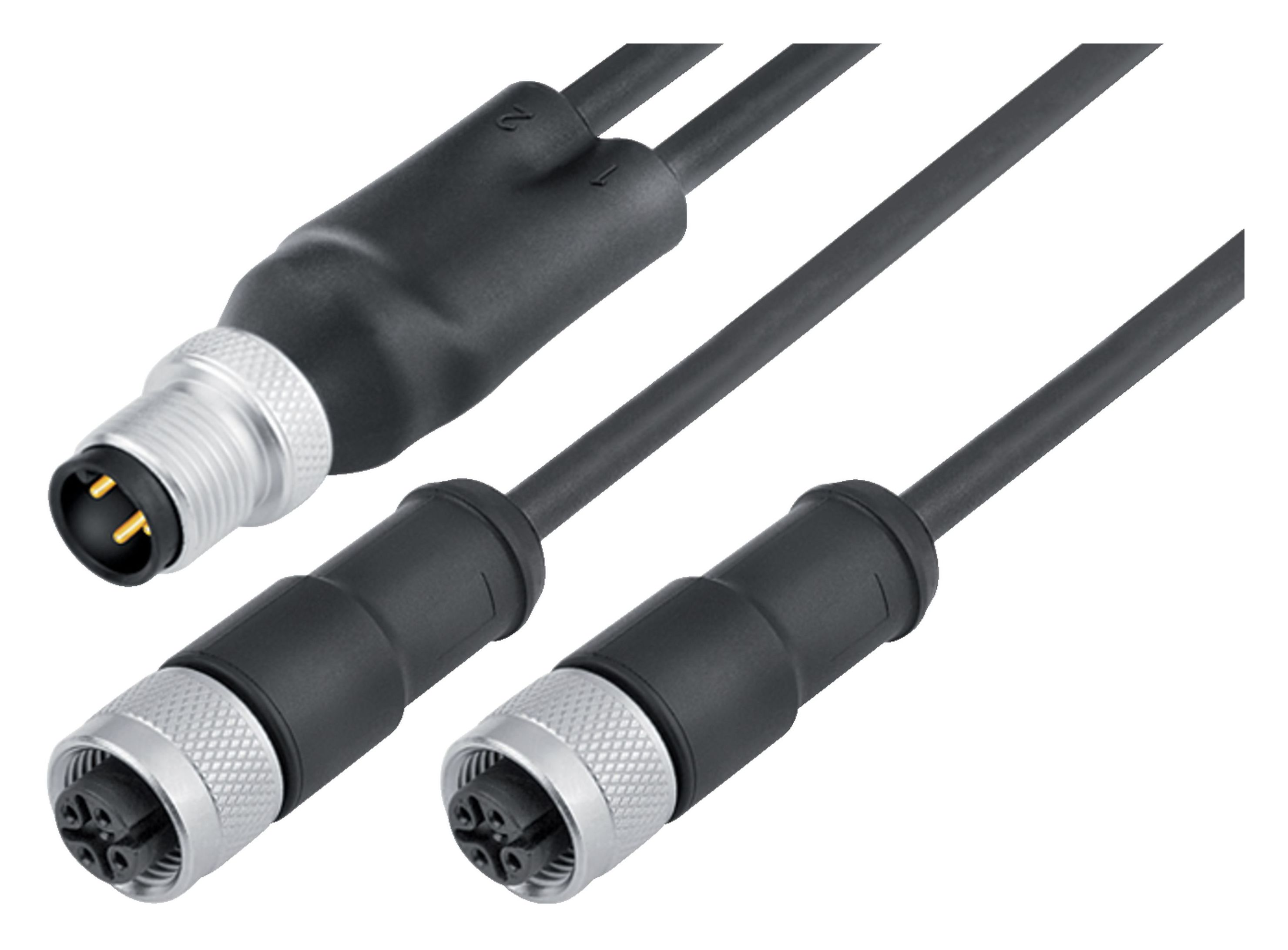 M12 Divisor de cables macho - 2 conector de cable hembra, Número de contactos: 4/3, blindado, moldeado en el cable, IP68, PUR, negro, 3 x 0,34 mm², 2 m