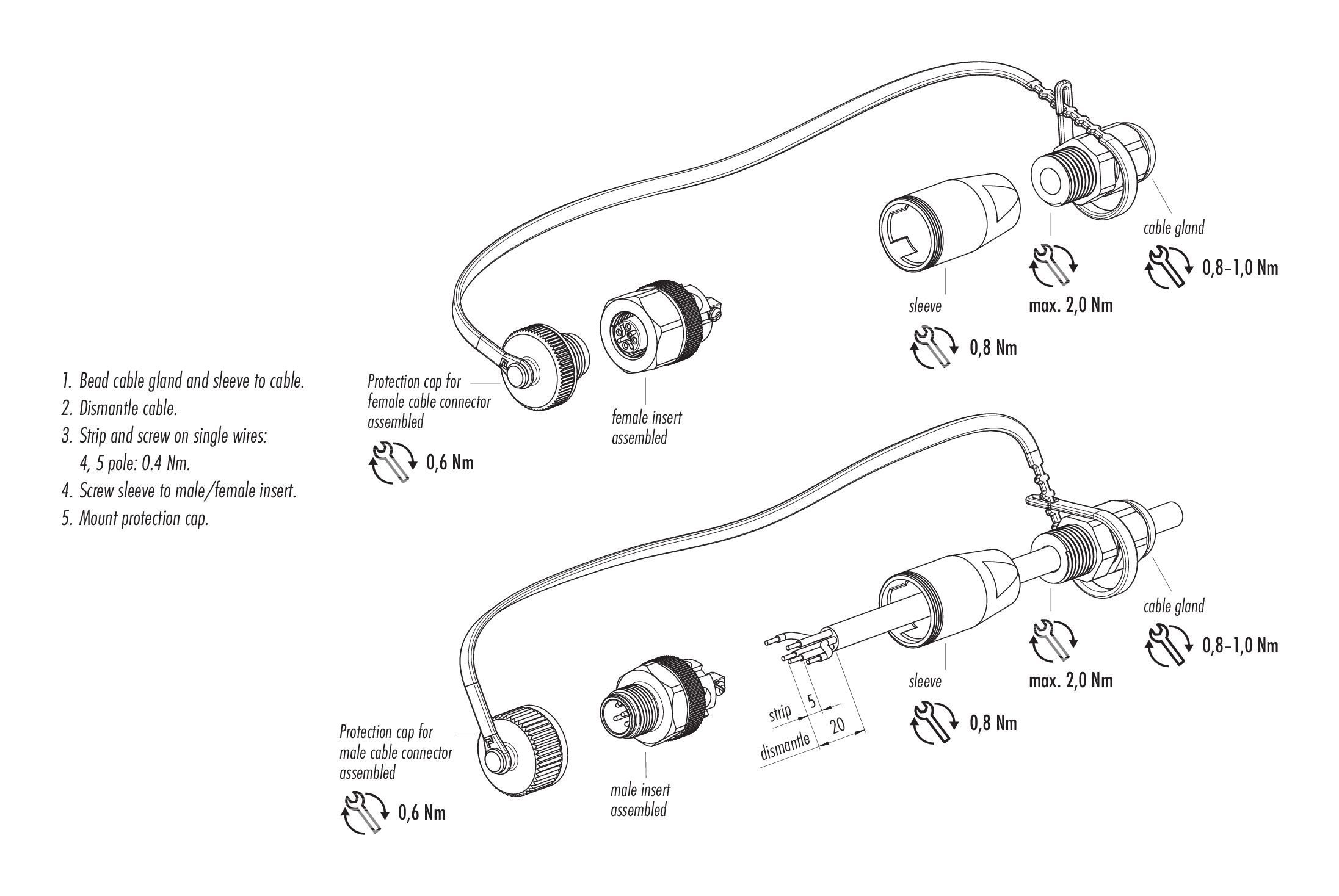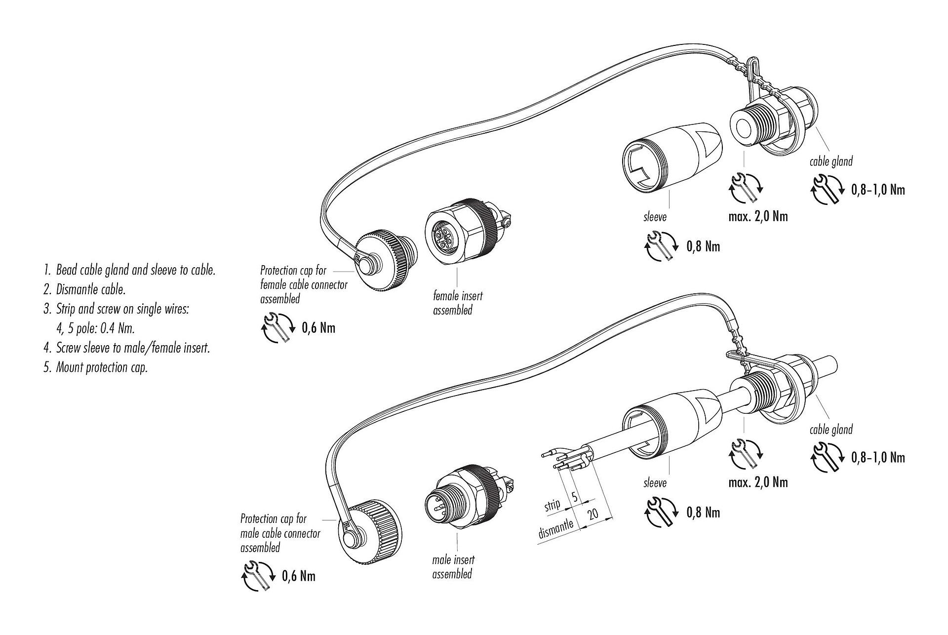 - Para bloquear el conector del cable con el conector del dispositivo, el anillo roscado se aprieta "apretado con la mano"(aprox. 60 cNm).