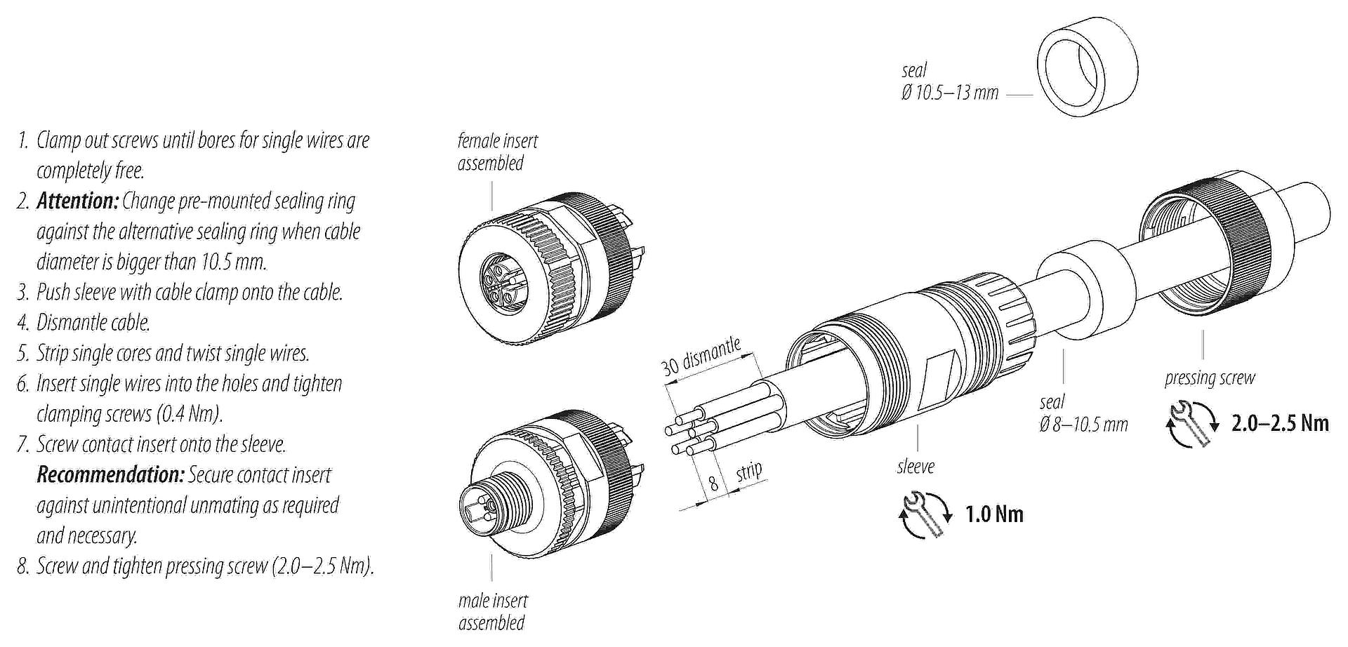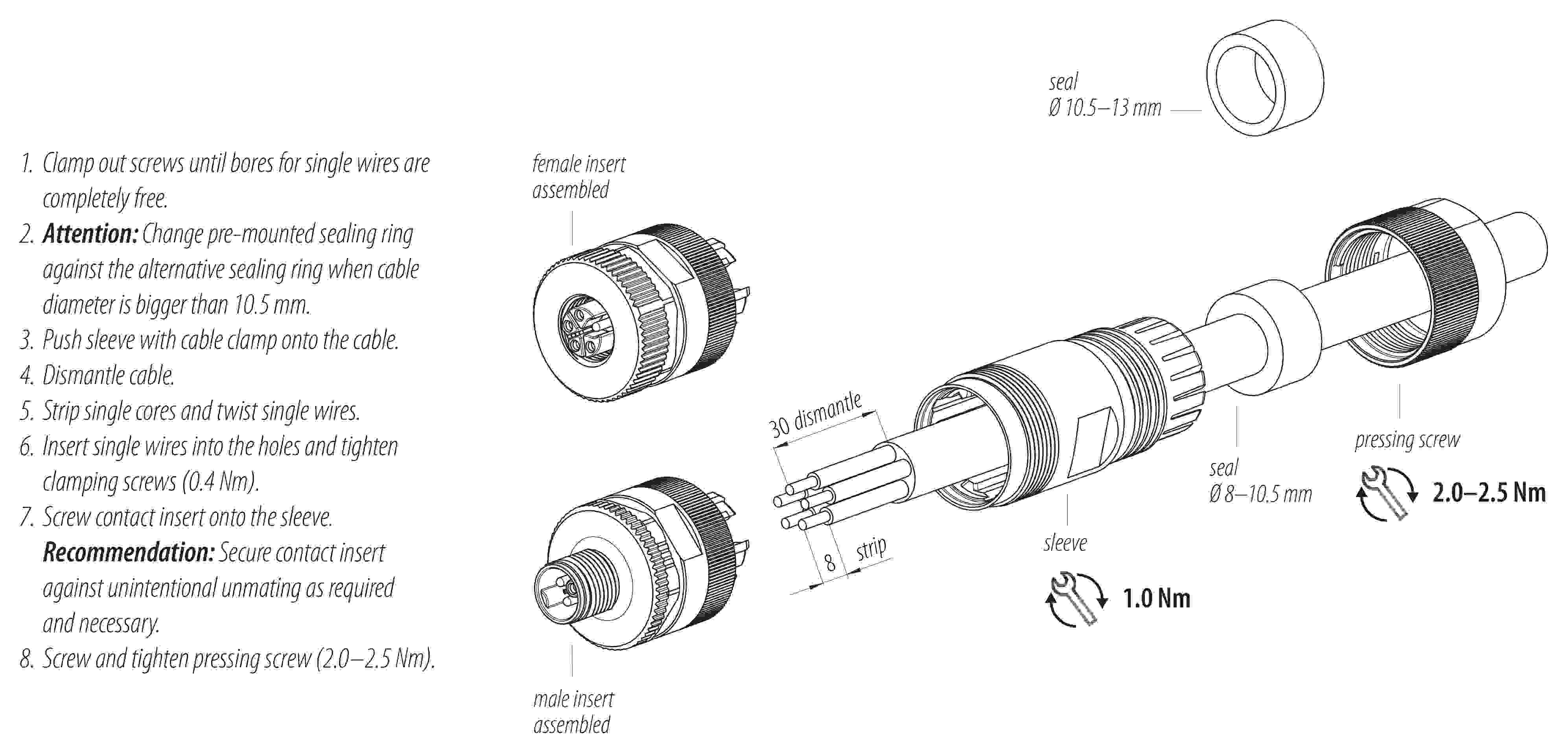 - Para proteger contra la apertura involuntaria del conector, la rosca entre la carcasa y la cabeza del conector debe asegurarse con un adhesivo de cianoacrilato adecuado cuando se use en circuitos con voltajes peligrosos al tacto. Esto no se aplica a los conectores utilizados en circuitos SELV y PELV según IEC 61140 (EN 61140, VDE 0140-1).