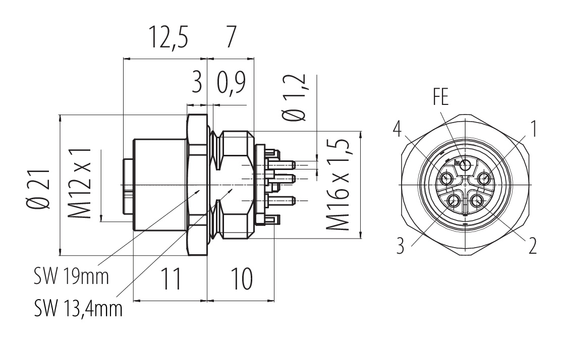 M12 Toma de brida, Número de contactos: 4+FE, sin blindaje, THR, IP67, UL 2238, M16x1,5, Montaje frontal