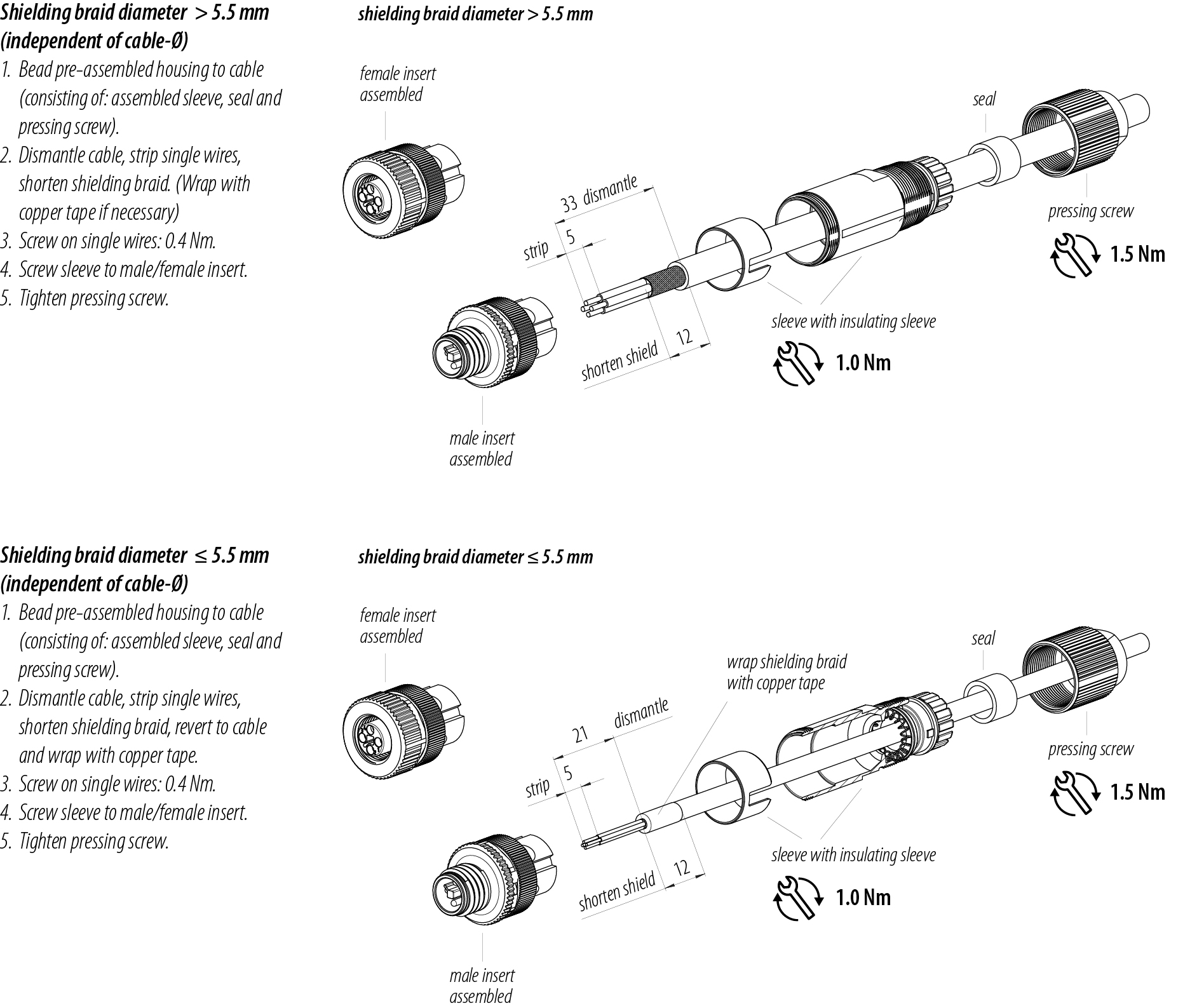 - Para proteger contra la apertura involuntaria del conector, la rosca entre la carcasa y la cabeza del conector debe asegurarse con un adhesivo de cianoacrilato adecuado cuando se use en circuitos con voltajes peligrosos al tacto. Esto no se aplica a los conectores utilizados en circuitos SELV y PELV según IEC 61140 (EN 61140, VDE 0140-1).