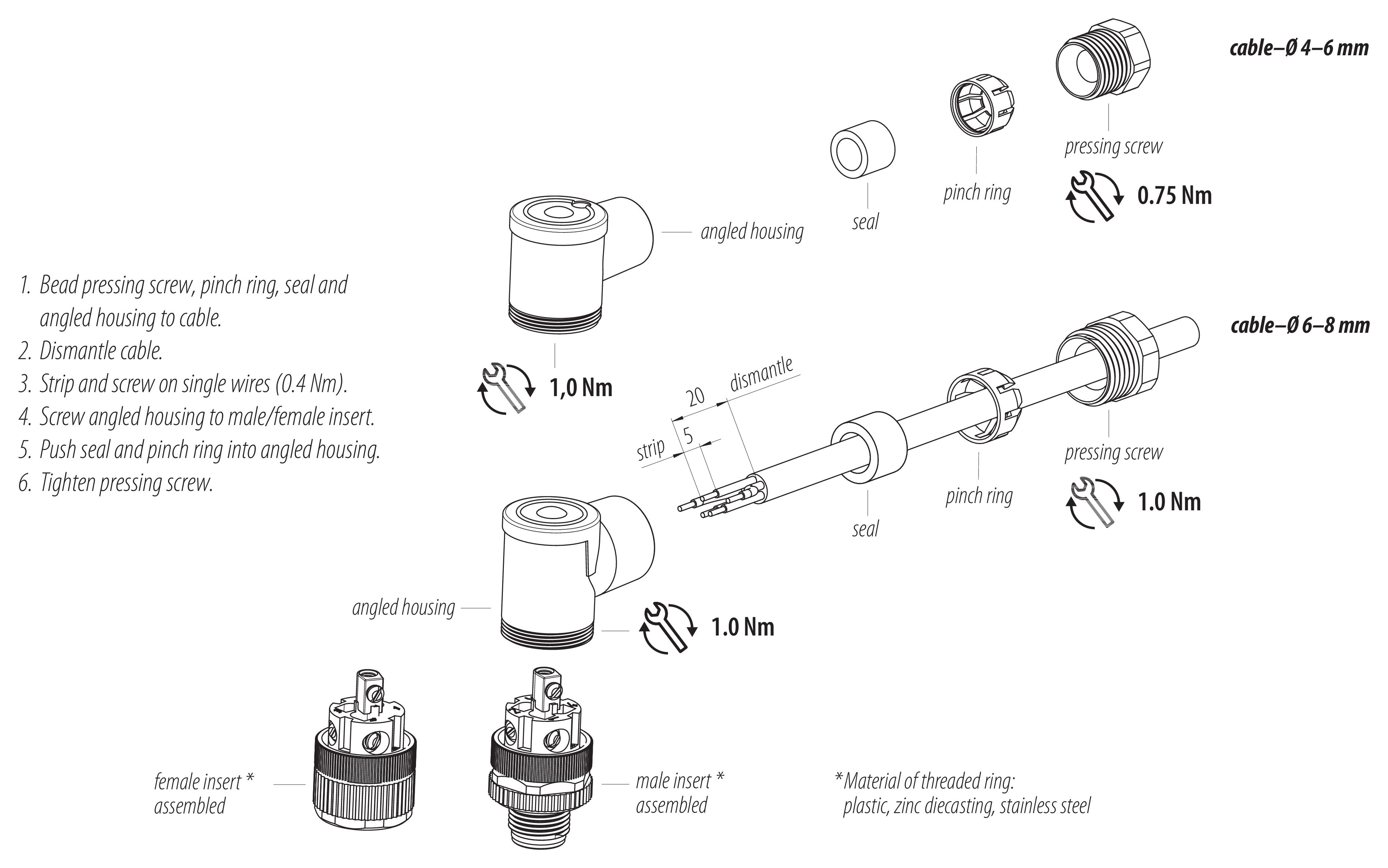 - Para proteger contra la apertura involuntaria del conector, la rosca entre la carcasa y la cabeza del conector debe asegurarse con un adhesivo de cianoacrilato adecuado cuando se use en circuitos con voltajes peligrosos al tacto. Esto no se aplica a los conectores utilizados en circuitos SELV y PELV según IEC 61140 (EN 61140, VDE 0140-1).