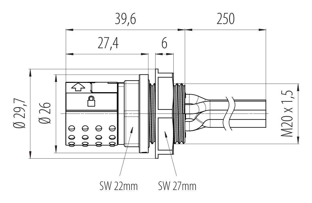 Bayoneta Toma de brida, Número de contactos: 6, sin blindaje, hilos, IP66/IP67, UL 2237, M20x1,5, Montaje frontal