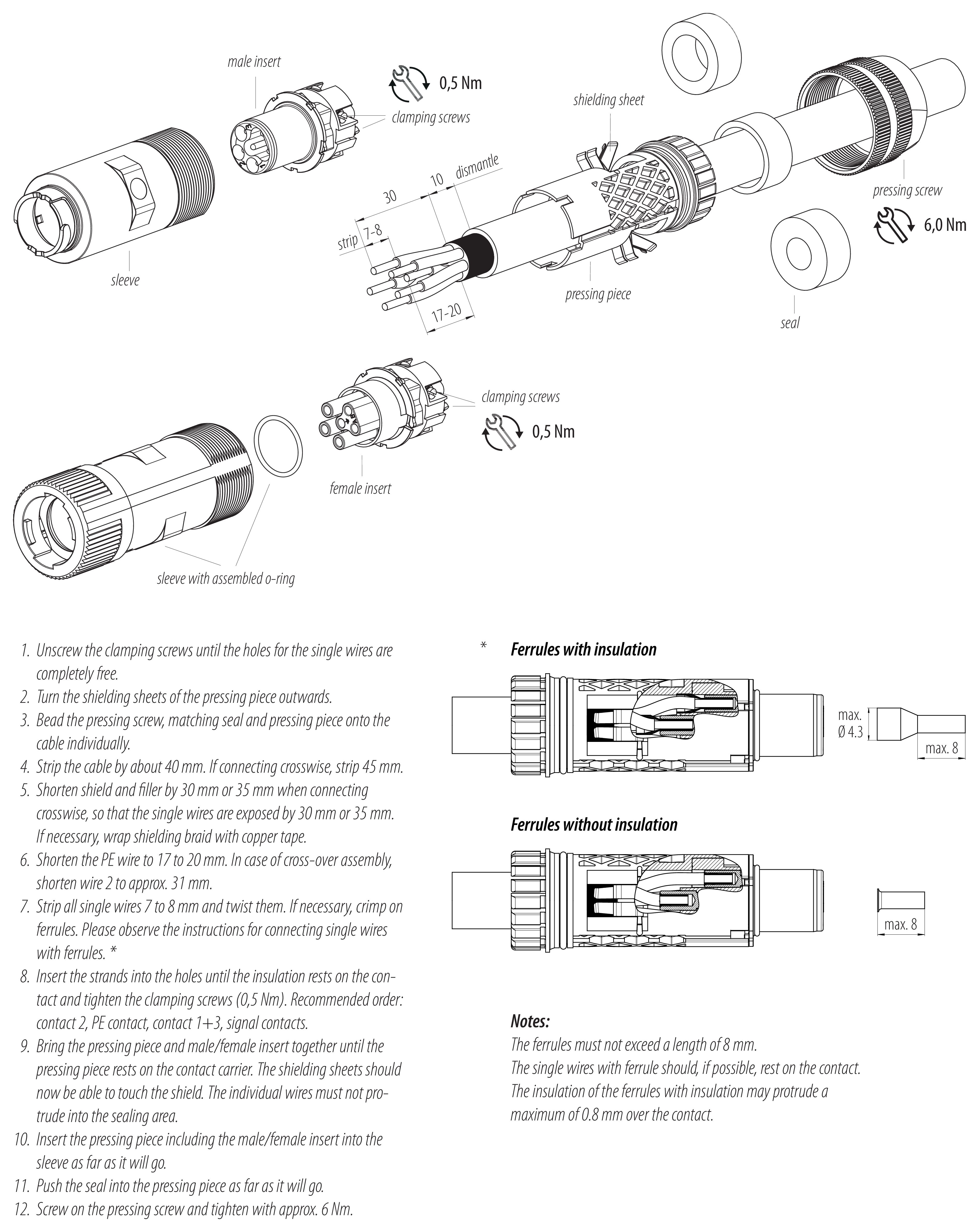 - Para proteger contra la apertura involuntaria del conector, la rosca entre la carcasa y la cabeza del conector debe asegurarse con un adhesivo de cianoacrilato adecuado cuando se use en circuitos con voltajes peligrosos al tacto. Esto no se aplica a los conectores utilizados en circuitos SELV y PELV según IEC 61140 (EN 61140, VDE 0140-1).