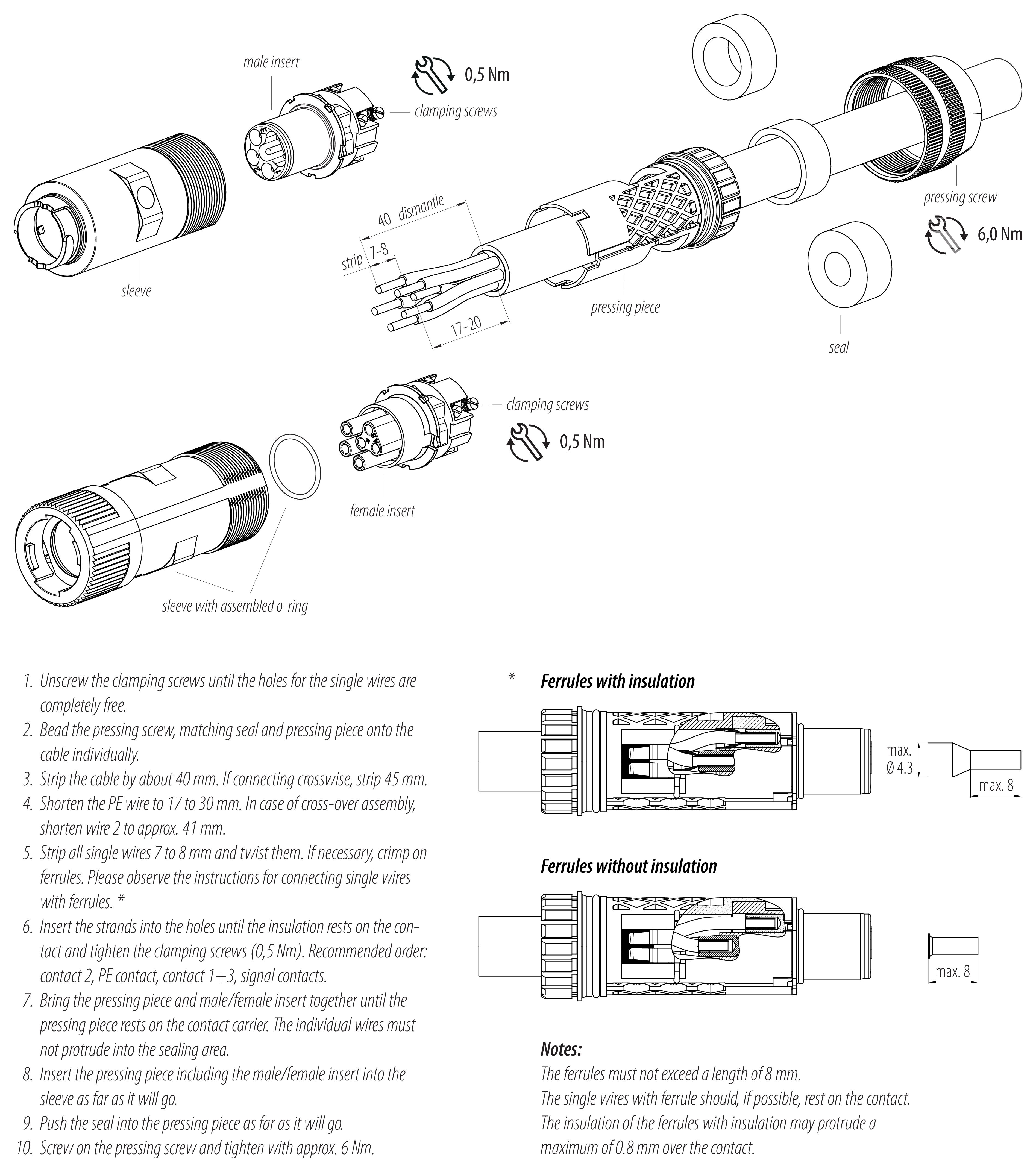 - Los conectores que se utilizan en circuitos con voltajes peligrosos al tacto sólo pueden ser instalados y utilizados por, o bajo la supervisión de, personas con formación en ingeniería eléctrica, teniendo en cuenta las normativas y normas aplicables.