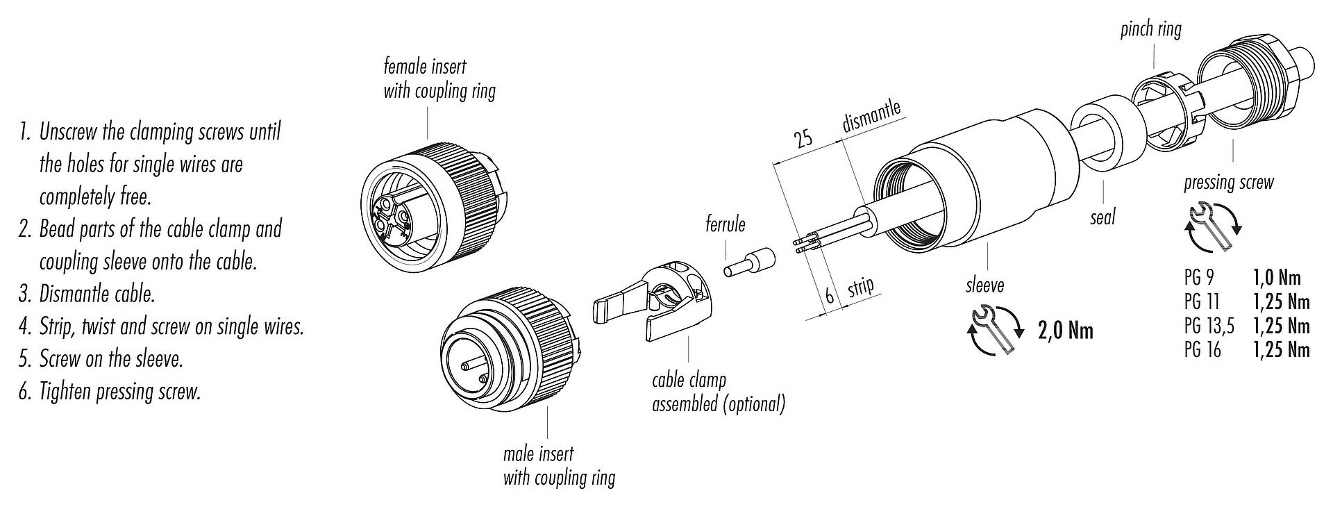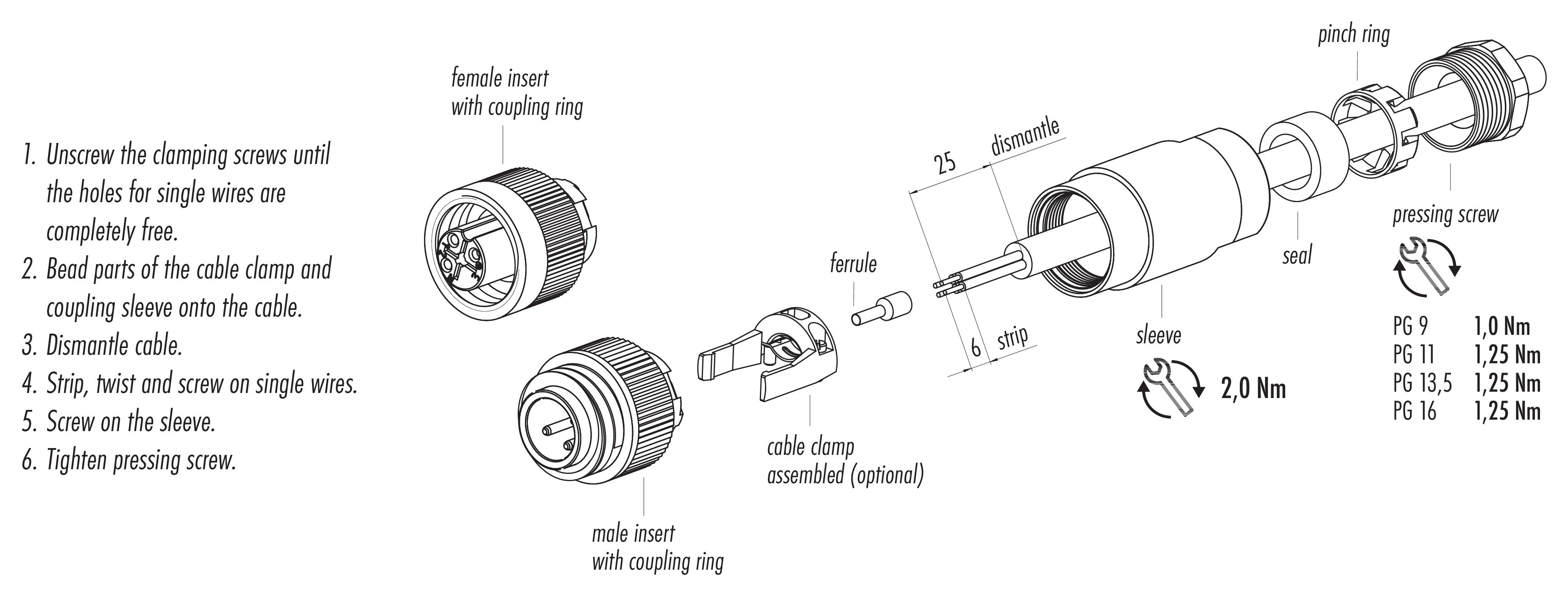 - Para proteger contra la apertura involuntaria del conector, la rosca entre la carcasa y la cabeza del conector debe asegurarse con un adhesivo de cianoacrilato adecuado cuando se use en circuitos con voltajes peligrosos al tacto. Esto no se aplica a los conectores utilizados en circuitos SELV y PELV según IEC 61140 (EN 61140, VDE 0140-1).
