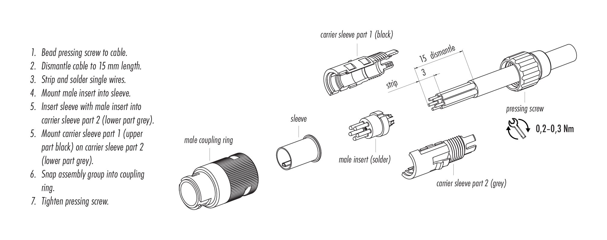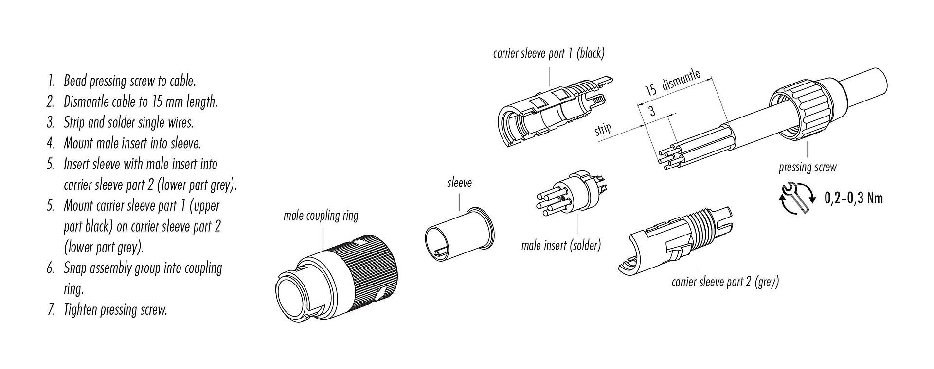 - Para proteger contra la apertura involuntaria del conector, la rosca entre la carcasa y la cabeza del conector debe asegurarse con un adhesivo de cianoacrilato adecuado cuando se use en circuitos con voltajes peligrosos al tacto. Esto no se aplica a los conectores utilizados en circuitos SELV y PELV según IEC 61140 (EN 61140, VDE 0140-1).