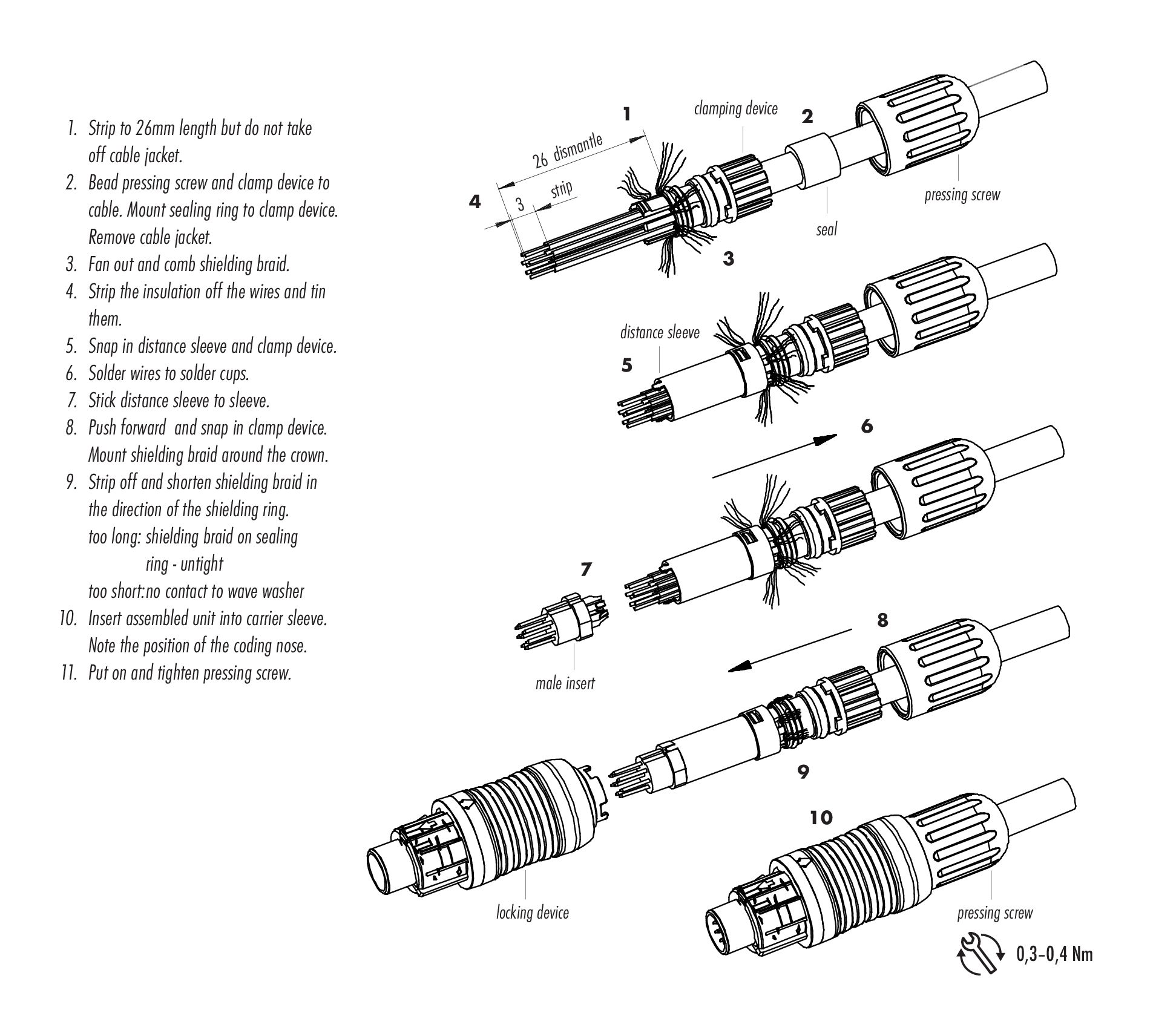 - Para proteger contra la apertura involuntaria del conector, la rosca entre la carcasa y la cabeza del conector debe asegurarse con un adhesivo de cianoacrilato adecuado cuando se use en circuitos con voltajes peligrosos al tacto. Esto no se aplica a los conectores utilizados en circuitos SELV y PELV según IEC 61140 (EN 61140, VDE 0140-1).