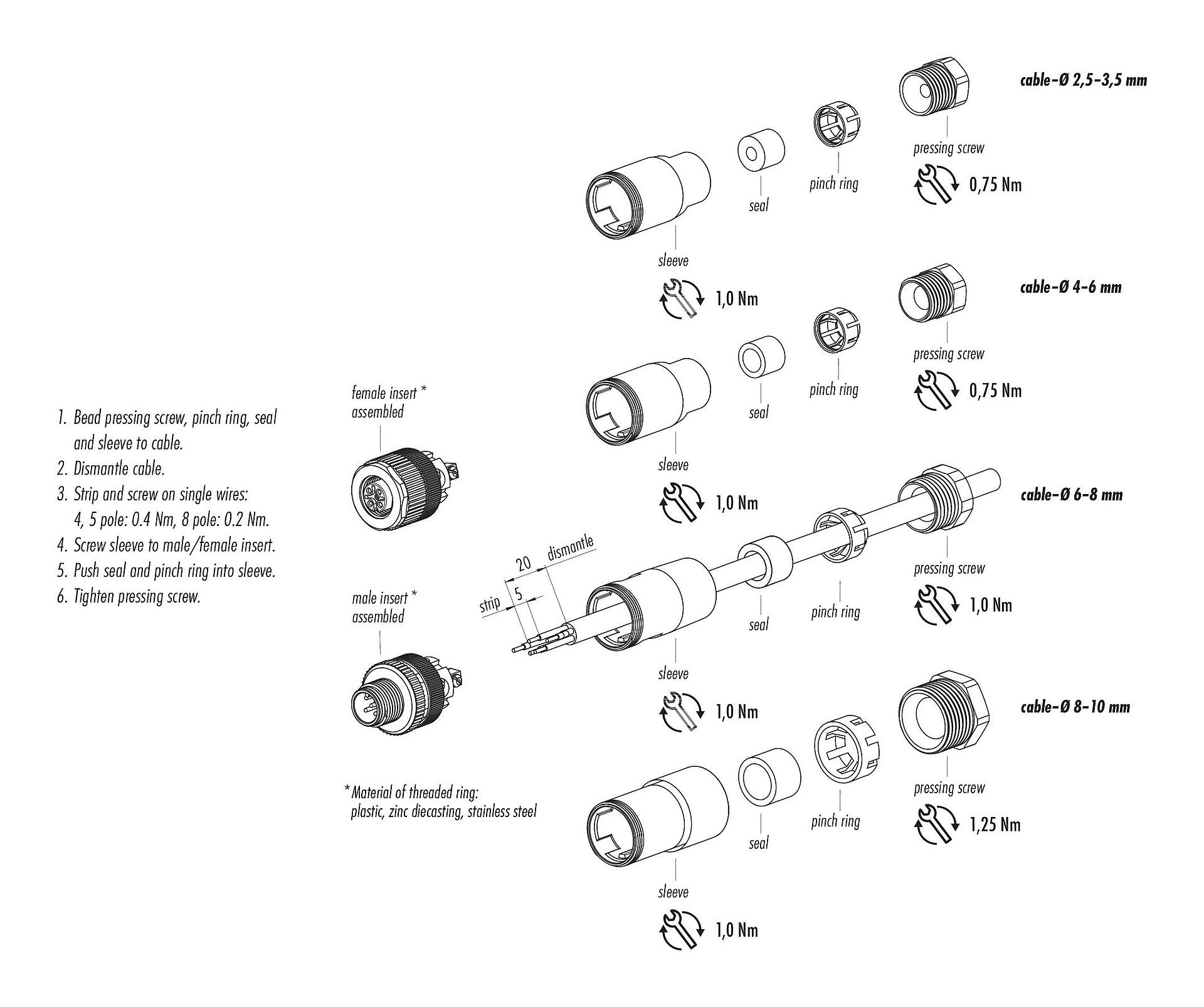 - Para bloquear el conector del cable con el conector del dispositivo, el anillo roscado se aprieta "apretado con la mano"(aprox. 60 cNm).