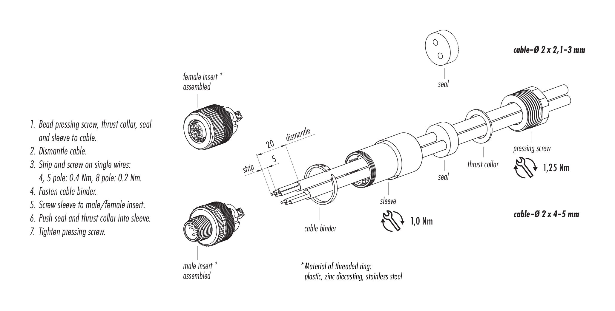 - Para bloquear el conector del cable con el conector del dispositivo, el anillo roscado se aprieta "apretado con la mano"(aprox. 60 cNm).