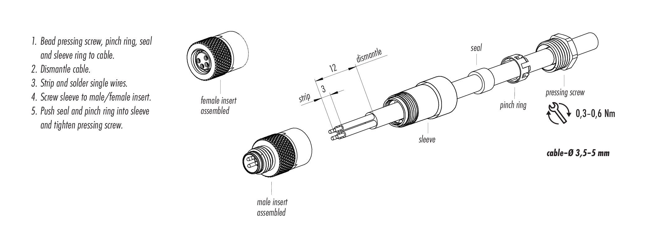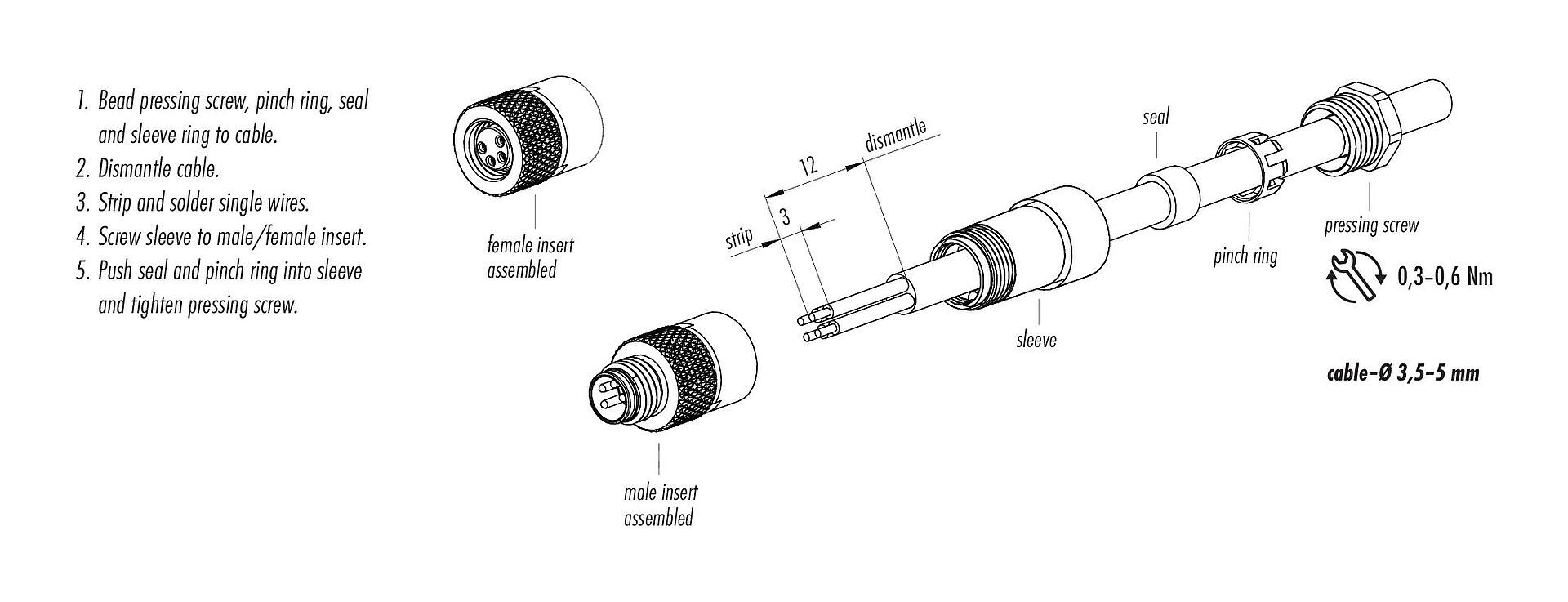 - Para proteger contra la apertura involuntaria del conector, la rosca entre la carcasa y la cabeza del conector debe asegurarse con un adhesivo de cianoacrilato adecuado cuando se use en circuitos con voltajes peligrosos al tacto. Esto no se aplica a los conectores utilizados en circuitos SELV y PELV según IEC 61140 (EN 61140, VDE 0140-1).