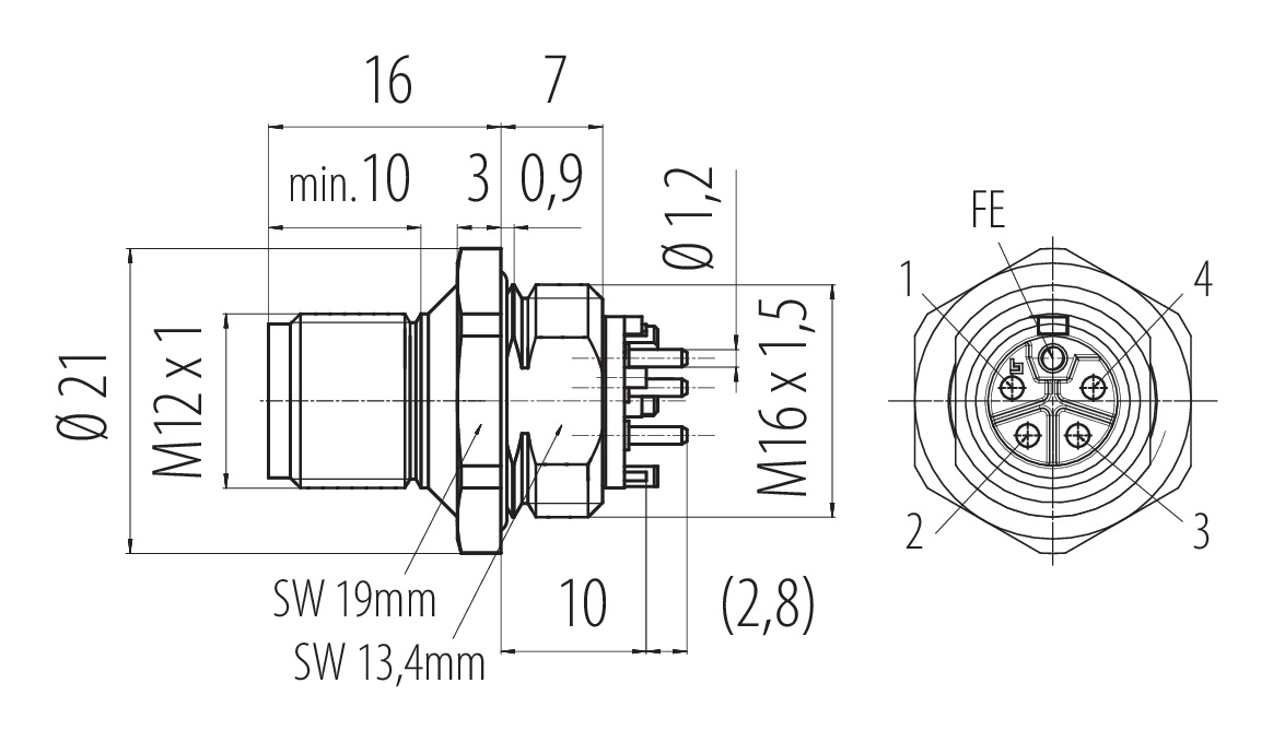 M12 Enchufe de brida, Número de contactos: 4+FE, sin blindaje, THR, IP67, UL 2238, M16x1,5, Montaje frontal