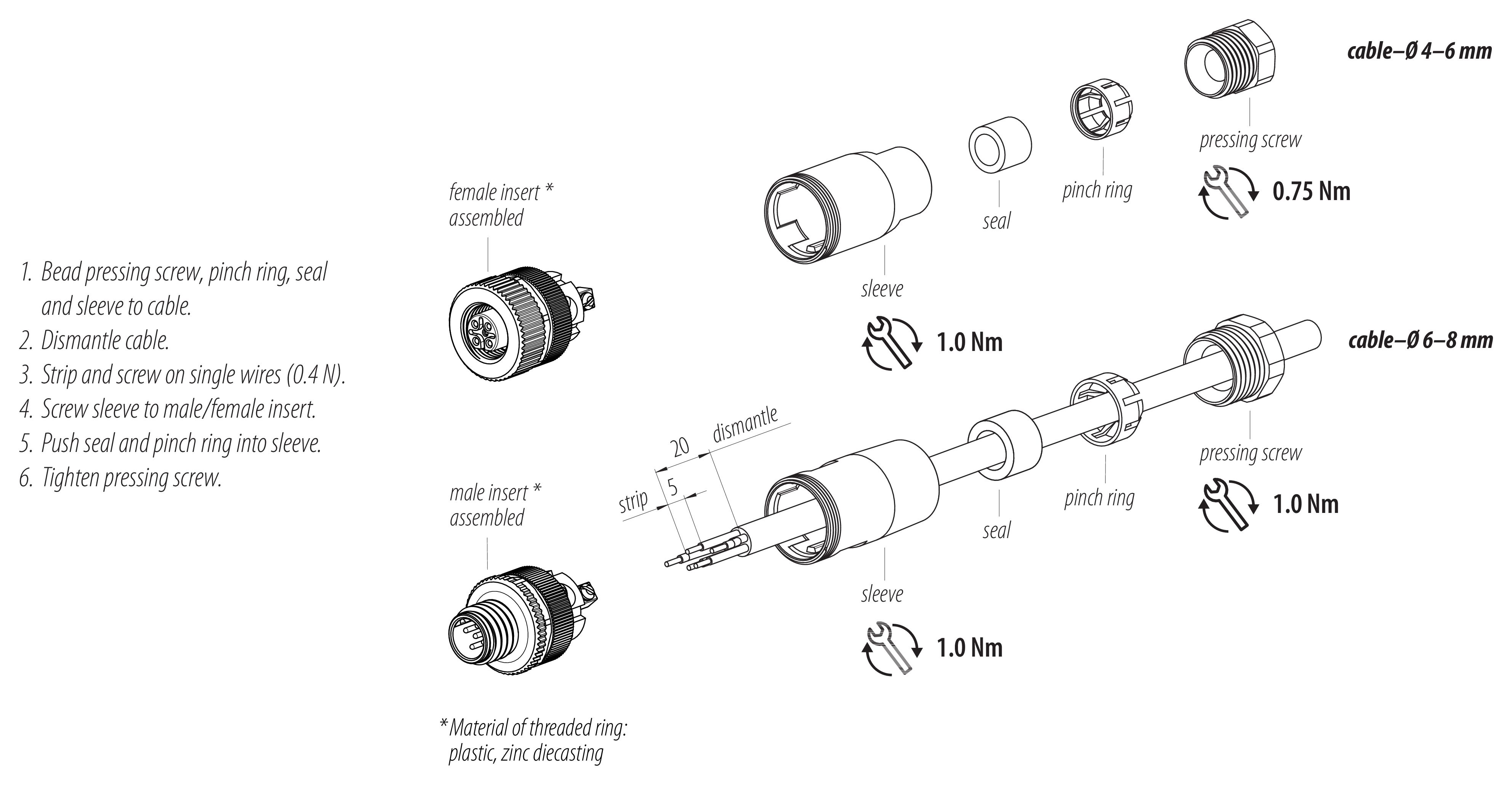 - Para bloquear el conector del cable con el conector del dispositivo, el anillo roscado se aprieta "apretado con la mano"(aprox. 60 cNm).