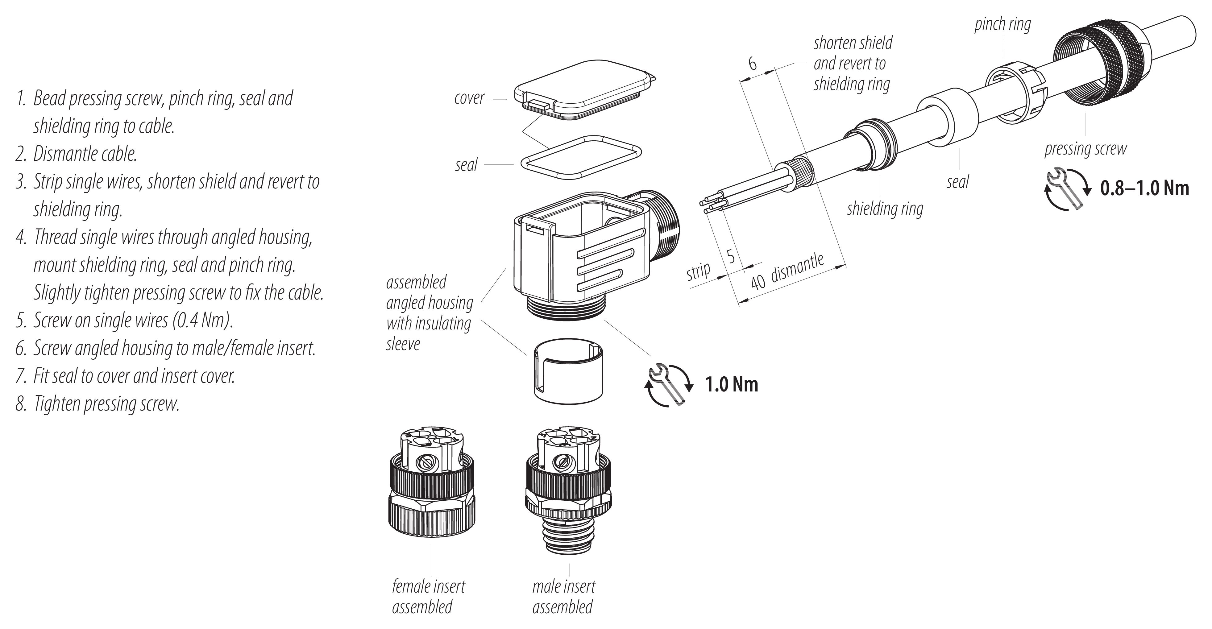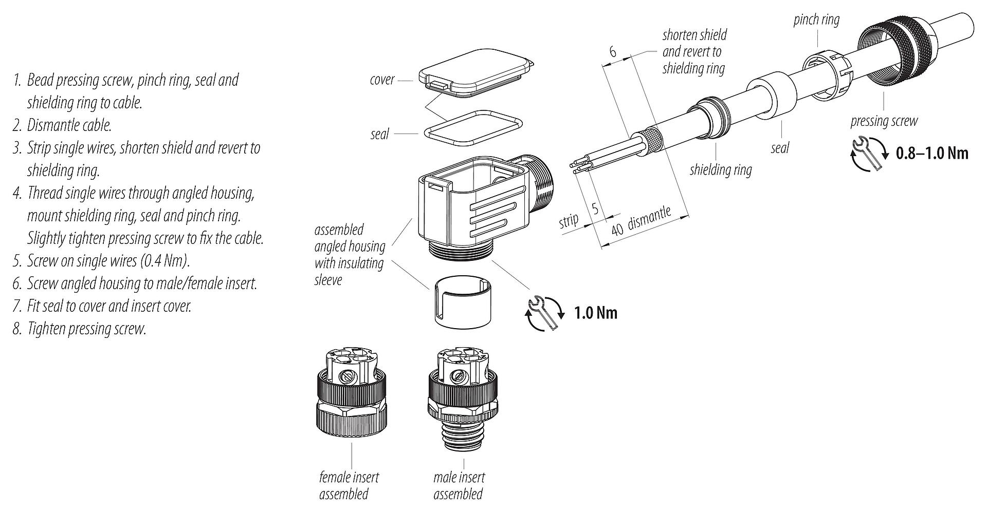 - Para proteger contra la apertura involuntaria del conector, la rosca entre la carcasa y la cabeza del conector debe asegurarse con un adhesivo de cianoacrilato adecuado cuando se use en circuitos con voltajes peligrosos al tacto. Esto no se aplica a los conectores utilizados en circuitos SELV y PELV según IEC 61140 (EN 61140, VDE 0140-1).