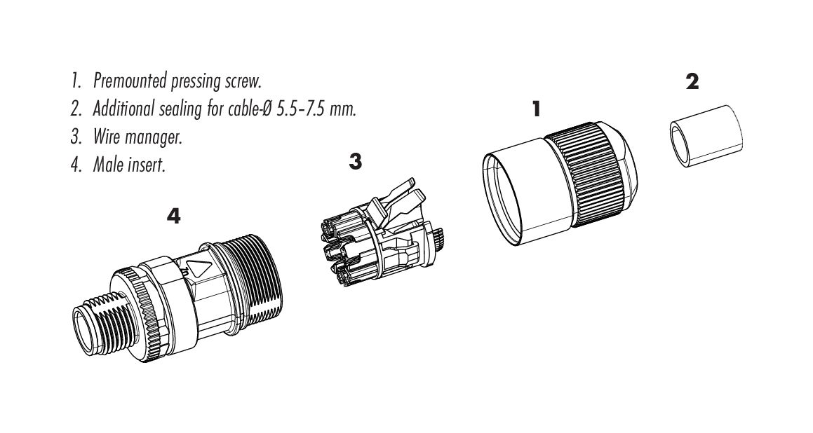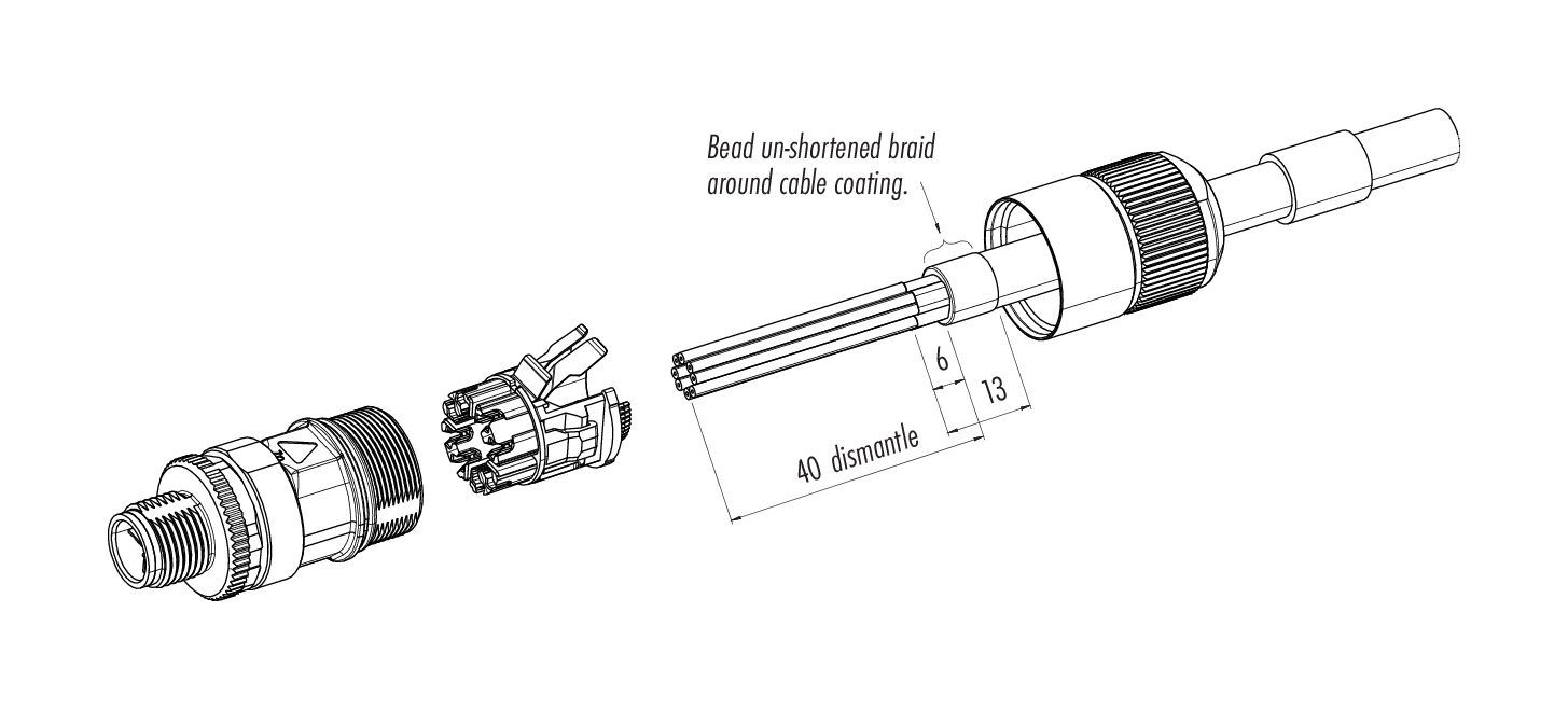- Para proteger contra la apertura involuntaria del conector, la rosca entre la carcasa y la cabeza del conector debe asegurarse con un adhesivo de cianoacrilato adecuado cuando se use en circuitos con voltajes peligrosos al tacto. Esto no se aplica a los conectores utilizados en circuitos SELV y PELV según IEC 61140 (EN 61140, VDE 0140-1).