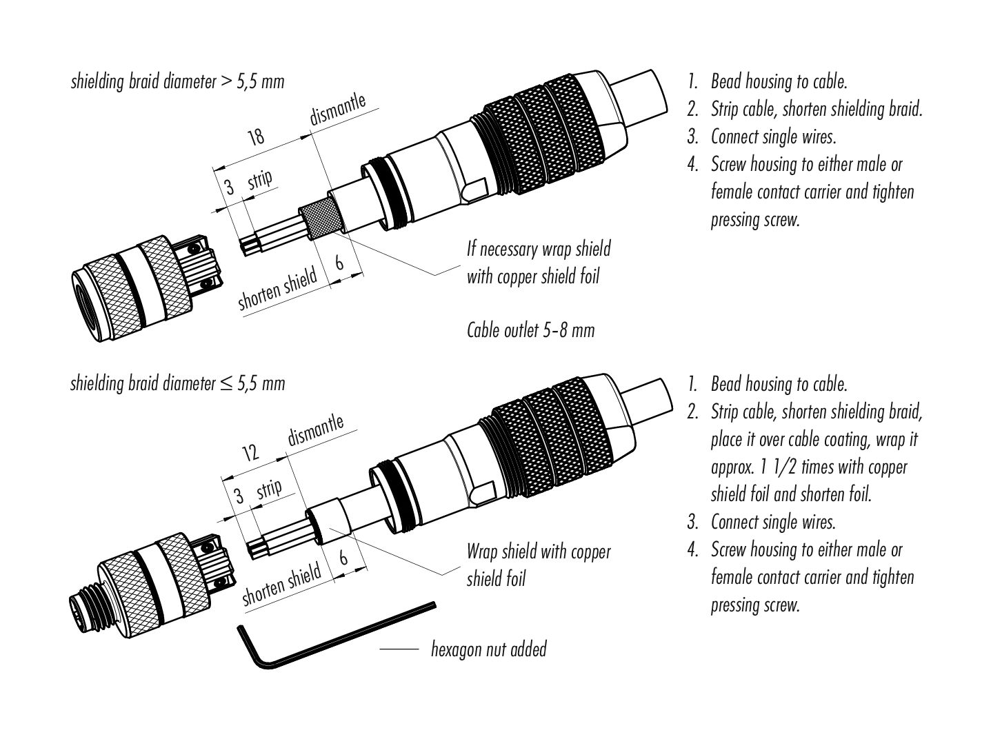 - Para proteger contra la apertura involuntaria del conector, la rosca entre la carcasa y la cabeza del conector debe asegurarse con un adhesivo de cianoacrilato adecuado cuando se use en circuitos con voltajes peligrosos al tacto. Esto no se aplica a los conectores utilizados en circuitos SELV y PELV según IEC 61140 (EN 61140, VDE 0140-1).